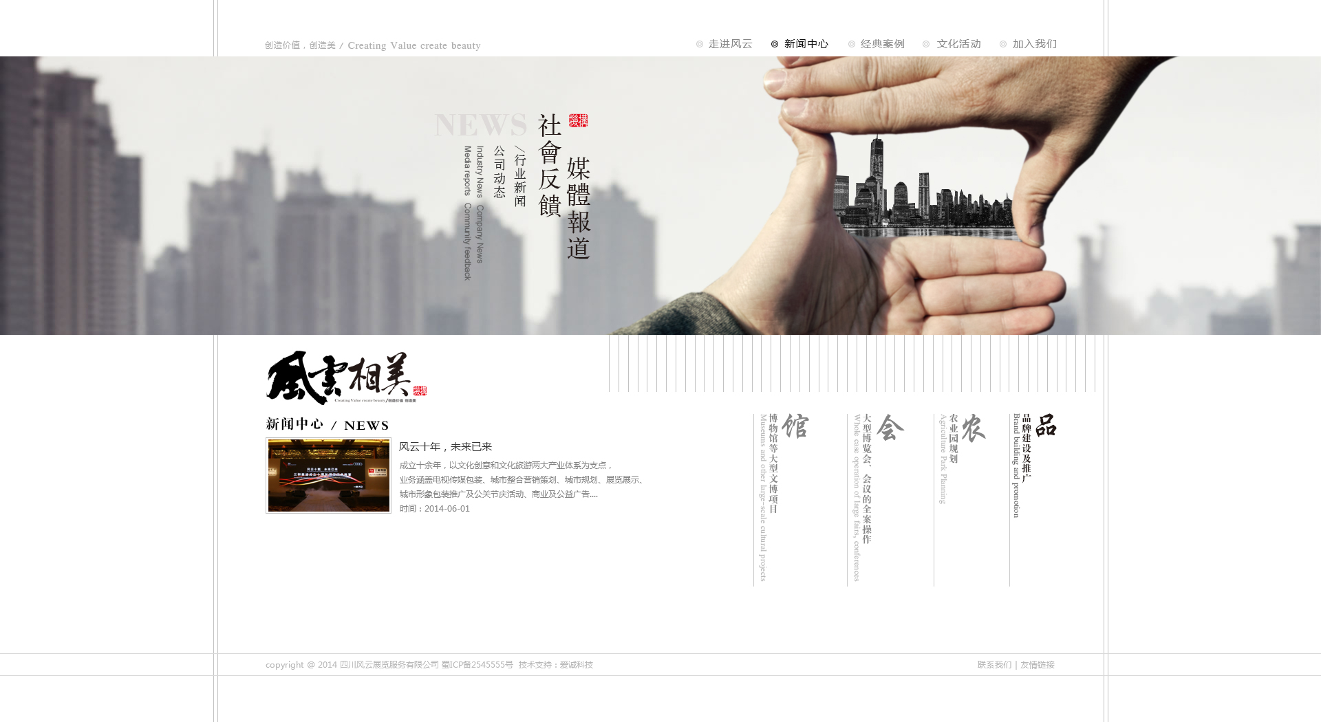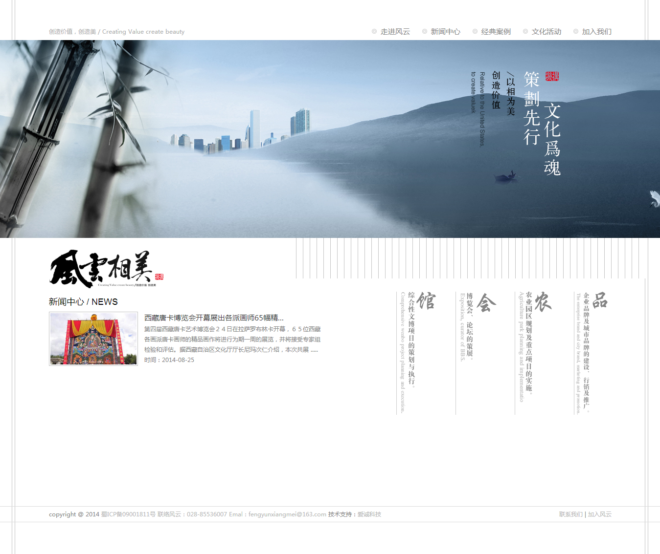 TAG: 风云相美机构由四川风云展览服务有限责任公司、四川风云相美广告传媒有限公司、四川相美创意农业策划设计工程有限公司、四川祁氏虫茶开发有限公司组成。风云相美机构,成立十余年,以文化创意和文化旅游两大产业体系为支点,业务涵盖休闲农业及旅游规划、博览会、博物馆、展览展示、品牌推广及公关节庆活动、数字科技、精品农业开发等领域。
