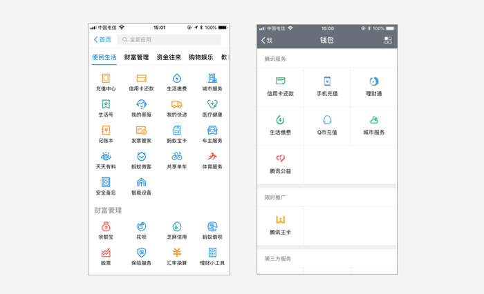 为什么要分类处理?因为当宫格数量过多时,依据功能的关联性做分类,可以便于用户更快地找到自己想要的功能,减少用户的寻找成本。
