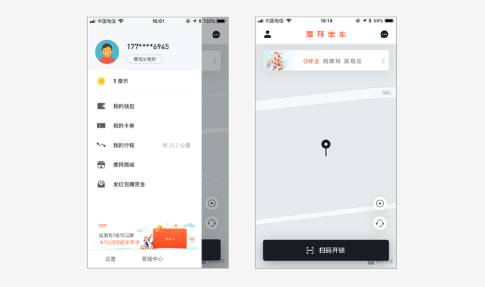 2)使用抽屉导航,通常意味着产品的主要功能集中在主页面当中。比如摩拜。