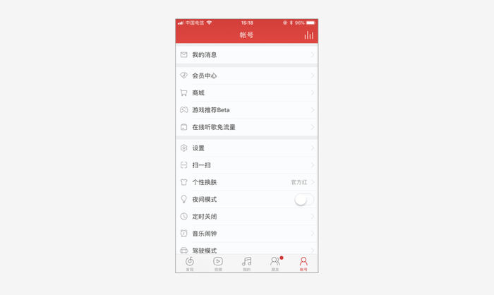 以列表的形式呈现功能,适用于大量的功能的展现,通常作为次级导航,如网易云音乐的账号页。