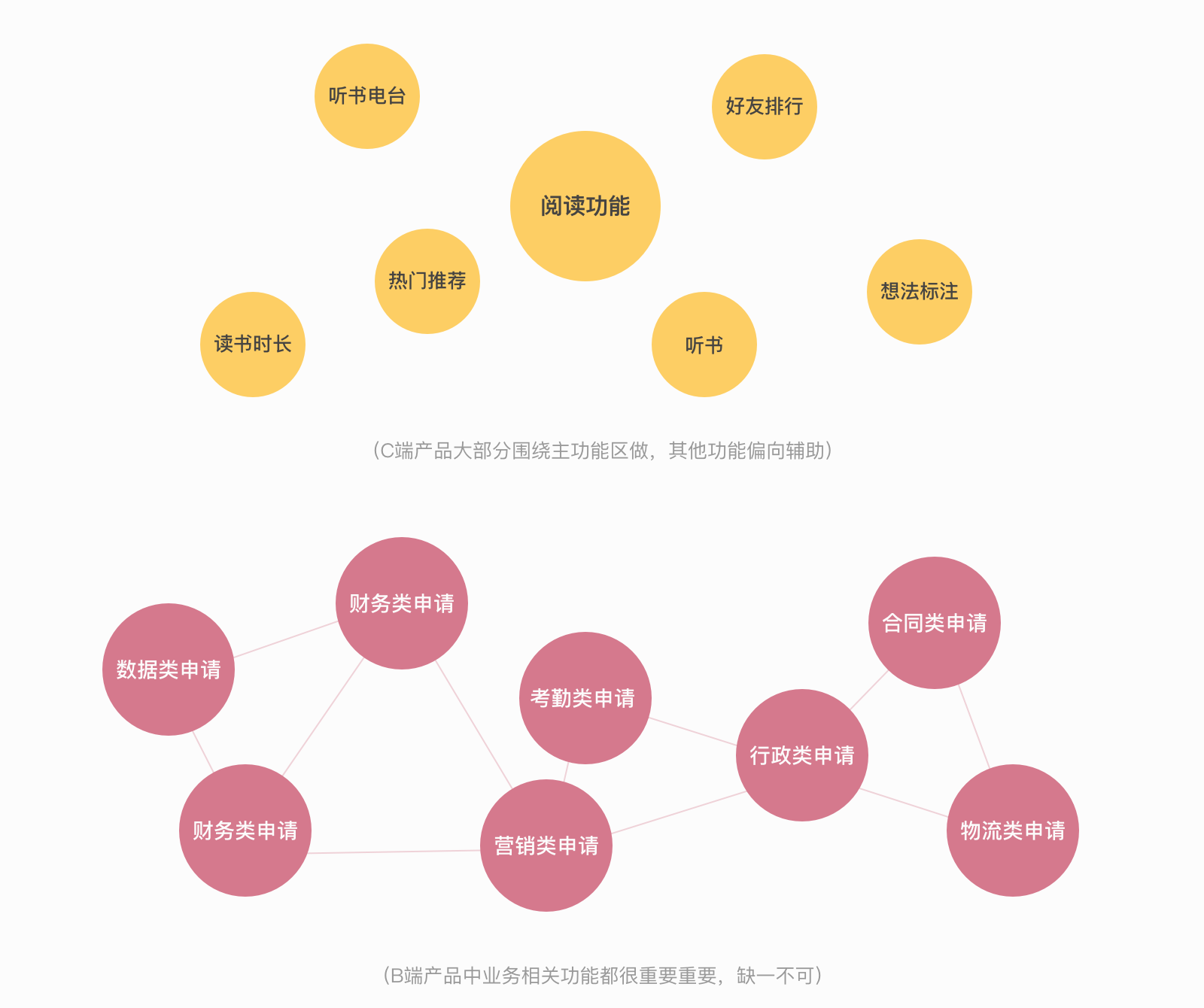 但是同样的情况出自于B端产品,可能就截然不同了,对于B端产品而言,功能是多而必要的。例如OA办公系统中的“申请提报功能”,这个功能针对的根本不是针对于单一类型的用户、单一类型的场景。而是针对很多不同岗位的用户以及不同的提报需求场景。所以很多初入B端产品的产品经理而言,他们认为“申请提报功能”只是一个信息输入页面,但是实际工作的时候却要按照七十多种不同的提报方式去设计内容,并且根据提报需求的不同,后续还会有更多的差异化设计(附件上传、日报提交、订单流审批等等)