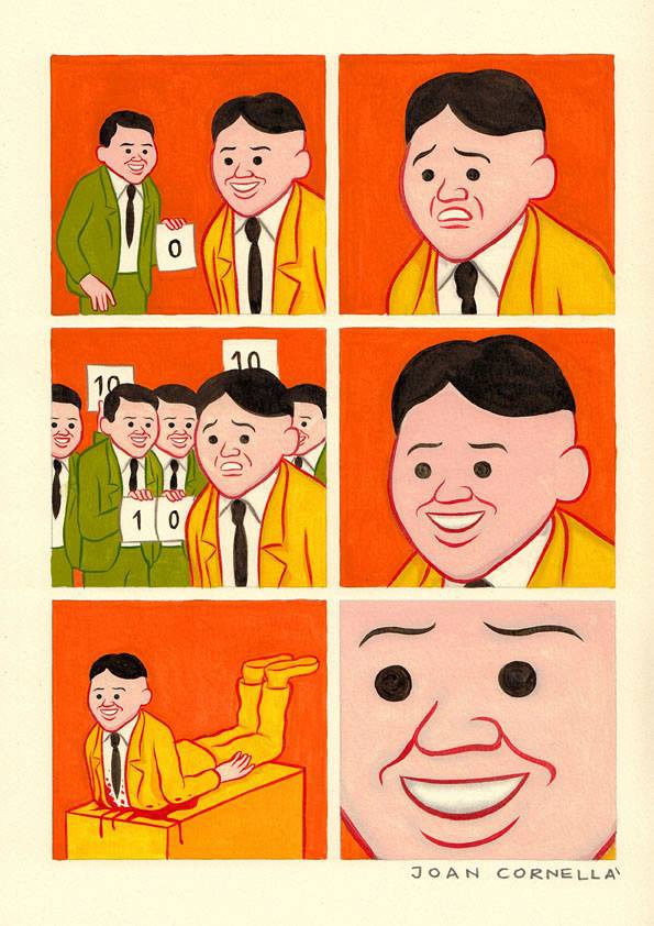 Joan Cornellá: 我连我昨天做过了什么都不记得,当然不可能记得它了,不过我猜一定是很赞的。我还是个孩子的时候,我的祖父教我画画。他是个好老师,也是个很吓人的画家,他在我家房子的墙上用牙刷画画。他是个色盲。